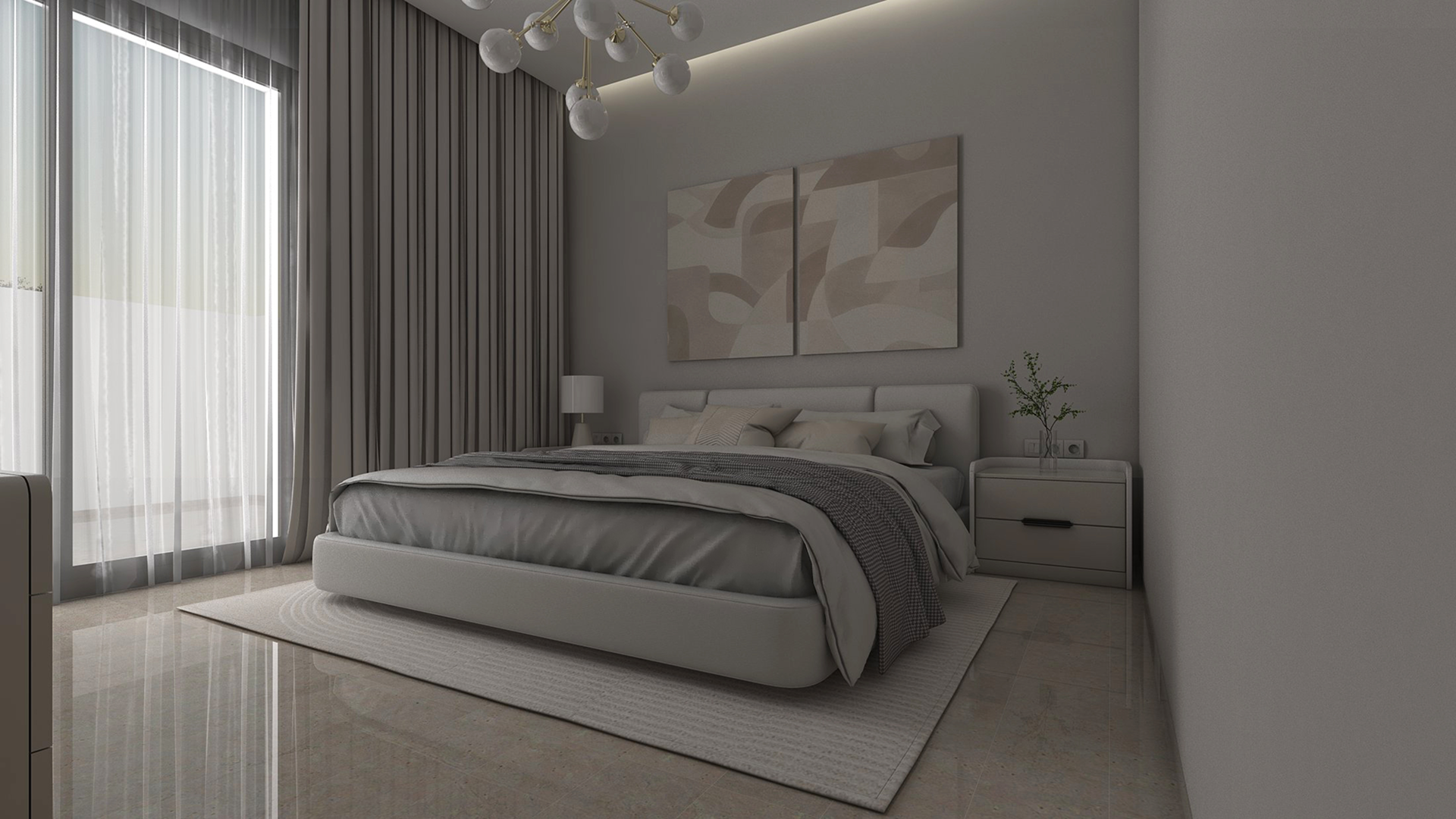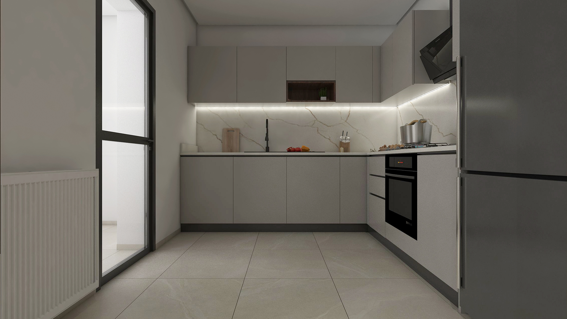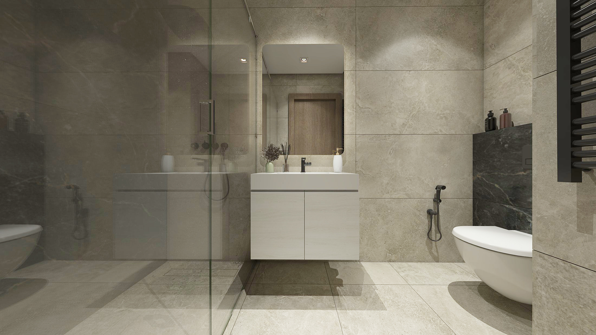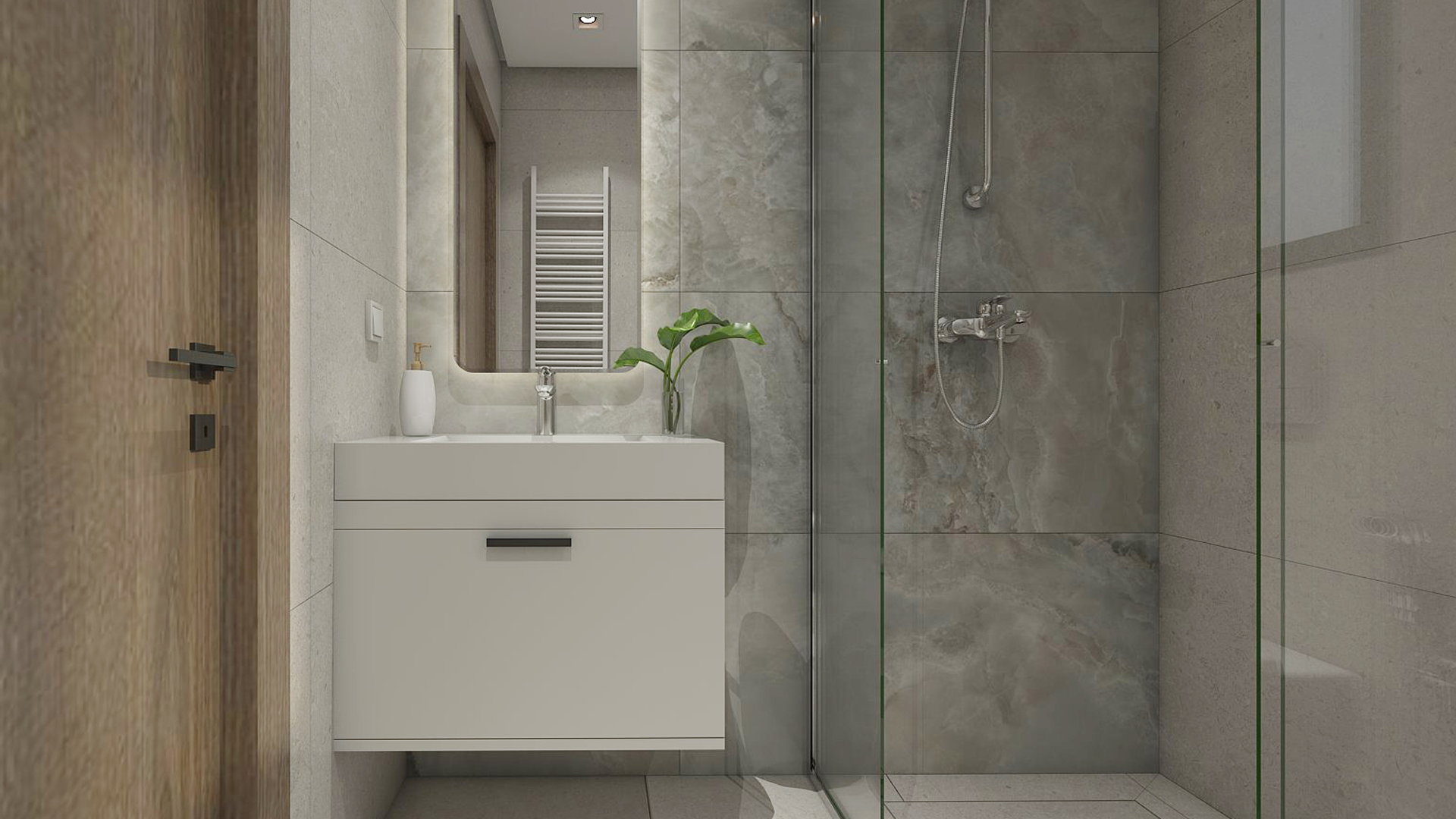 Le marbre clair, méticuleusement sélectionné, apporte une touche de sophistication tout en renforçant la luminosité naturelle des pièces. Cet esprit épuré s’allie parfaitement aux éléments en bois à finition mate, qui insufflent chaleur et douceur, offrant ainsi un équilibre parfait entre design contemporain et confort quotidien.